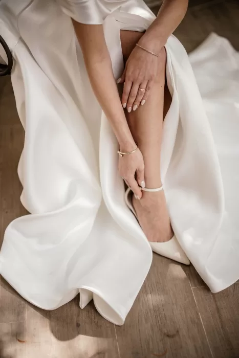 The bride chose a structured off-the-shoulder gown with a thigh-high slit, pairing it with a bouquet of creamy peonies tied with silk ribbon. Her styling was classic with a modern twist: a sleek bun, pearl drop earrings, and sheer gloves worn just for the ceremony. Getting ready was as joyful as the day itself, with a bridesmaid in a champagne-toned dress helping with the final zip.