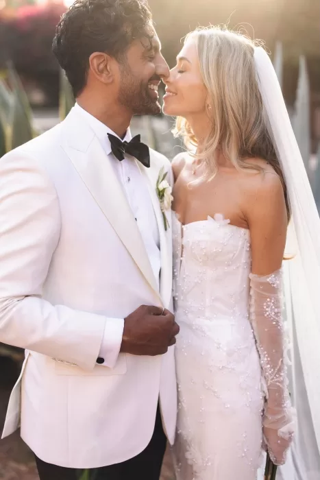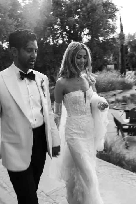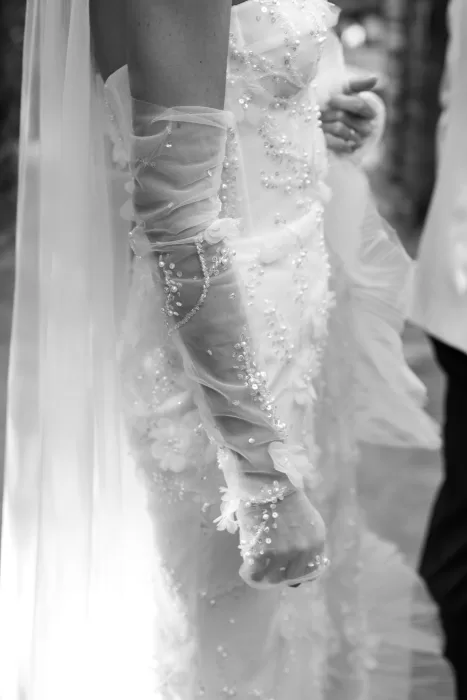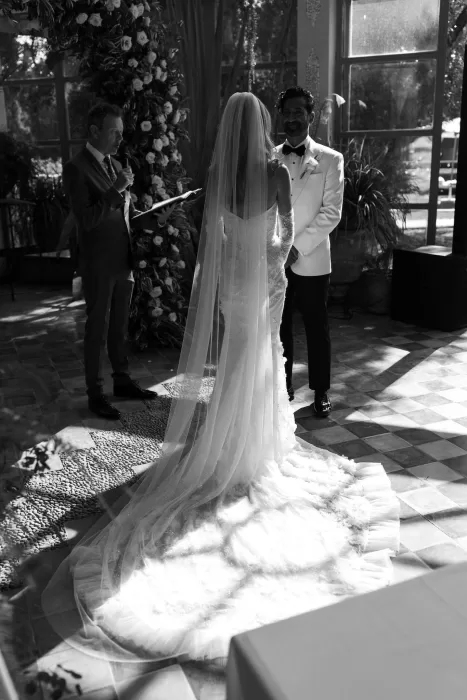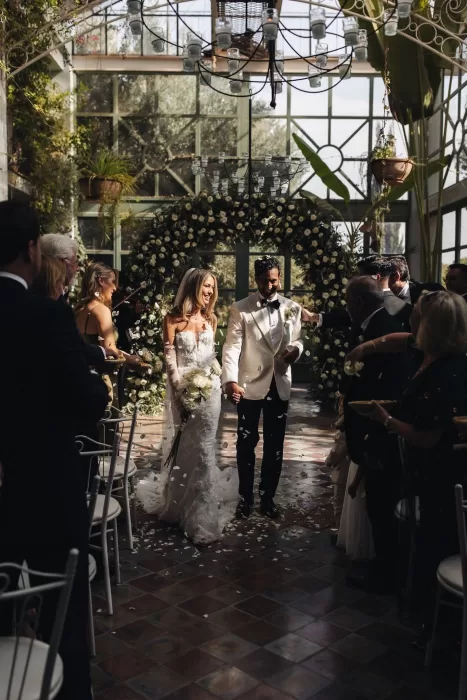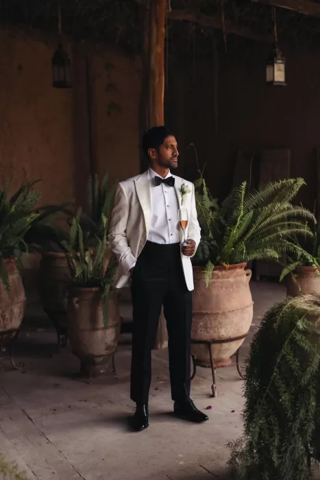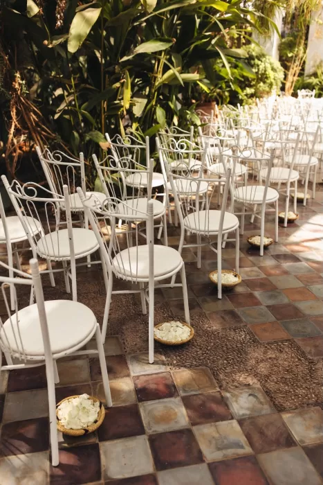 The ceremony unfolded in the venue’s glasshouse, where climbing greenery and dappled sunlight created a naturally cinematic backdrop. Rows of white chairs framed the aisle, leading to an arch of roses that felt timeless yet modern in its simplicity. “It was such a pleasure to come and capture this at the stunning Beldi Club in Morocco,” the photographers reflected, “our first visit to this wonderful part of the world.” It’s a destination that resonates not just for its aesthetic, but for the way it holds space for celebration, a perfect fit for couples seeking a wedding in Morocco.