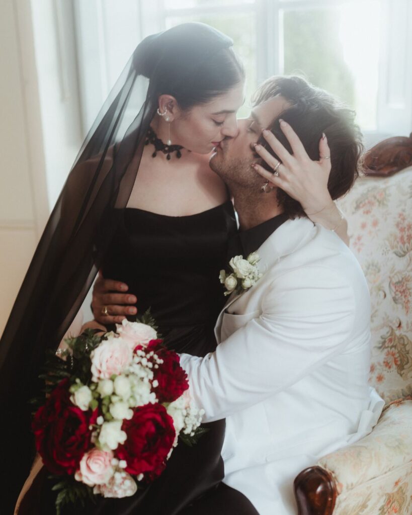 The bride’s gown — a sweeping silk creation in midnight blue — flowed like ink across the terracotta floors, its open back and delicate straps offering a contrast between elegance and defiance. Paired with a dramatic black veil, she was nothing short of cinematic. A pearl bracelet, sculptural earrings, and a gothic lace choker completed the look, balancing softness with a touch of rebellion.