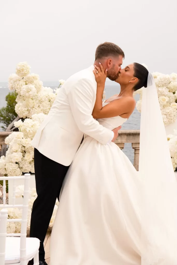 Kate wore two looks: a sleek strapless gown for the ceremony and a form-fitting lace dress for the evening. Her look was polished yet understated, complemented by soft, natural makeup. The groom and his party opted for classic black tuxedos, while Tom stood out in an ivory dinner jacket—a timeless contrast that felt perfectly suited to the warm, stone backdrop of Maricel’s terrace.