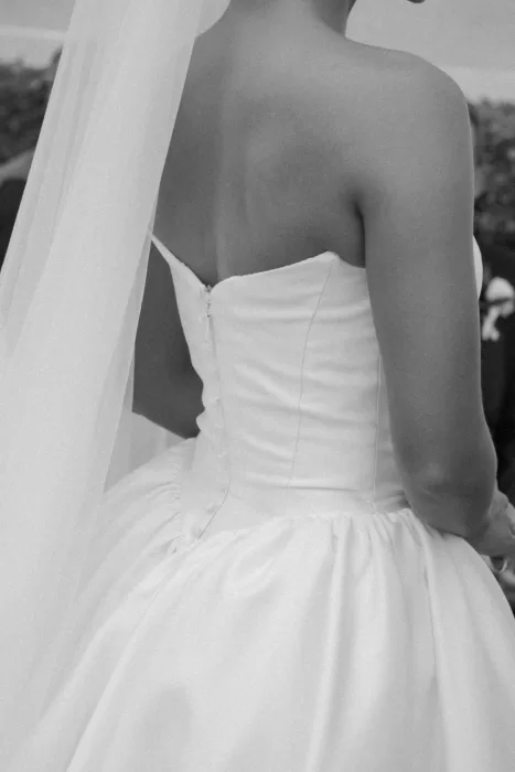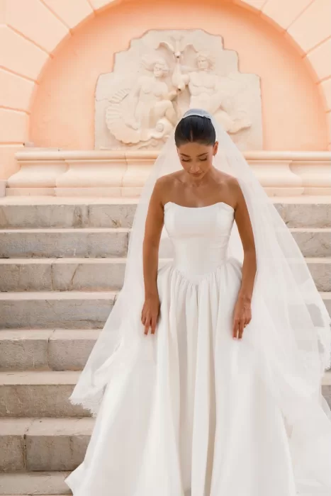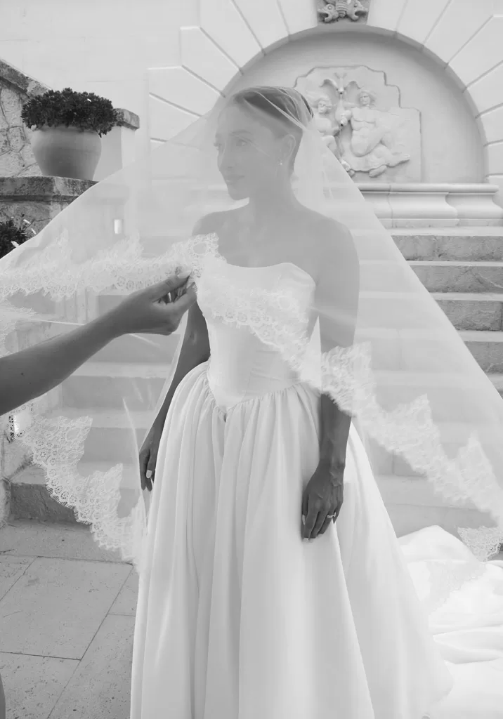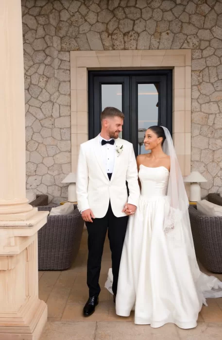 Kate wore two looks: a sleek strapless gown for the ceremony and a form-fitting lace dress for the evening. Her look was polished yet understated, complemented by soft, natural makeup. The groom and his party opted for classic black tuxedos, while Tom stood out in an ivory dinner jacket—a timeless contrast that felt perfectly suited to the warm, stone backdrop of Maricel’s terrace.