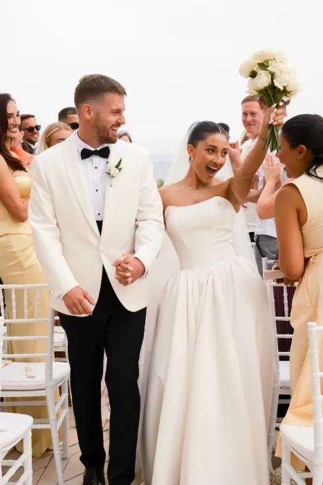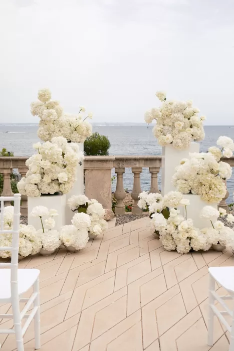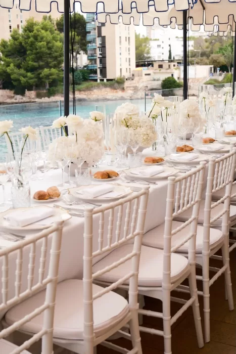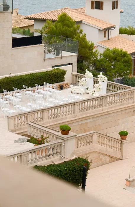 The ceremony took place on a sunlit terrace overlooking the water, framed by sculptural white florals that echoed the minimalist elegance of the space. Rows of white chairs led to a modern floral installation, creating a serene, coastal palette that let the sea speak for itself. For couples dreaming of a wedding in Mallorca, this is the kind of effortless beauty the island does best—luxury without pretense.