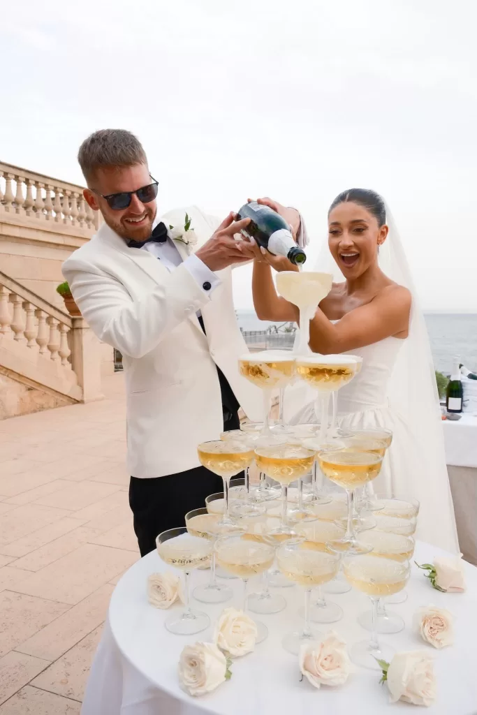 The celebration transitioned seamlessly from sunset to starlight. A champagne tower signaled the start of the evening’s festivities—a moment that captured the couple’s joy and the vibrant spirit of Mallorca. Under soft lighting and sea air, the night unfolded as one long exhale of happiness, with music, laughter, and views that only this island could offer.