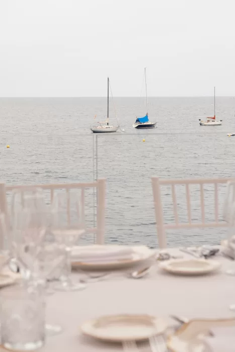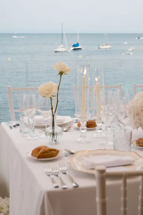 As the sun dipped below the horizon, dinner tables lined the edge of the sea. Crisp linens, single-stem roses, and glass candle holders created an atmosphere that was both intimate and elevated. Guests dined with sailboats drifting just beyond the glass terrace—a quiet reminder of the magic of a Mallorca coastal wedding. The sound of clinking glasses and live saxophone music carried into the night.