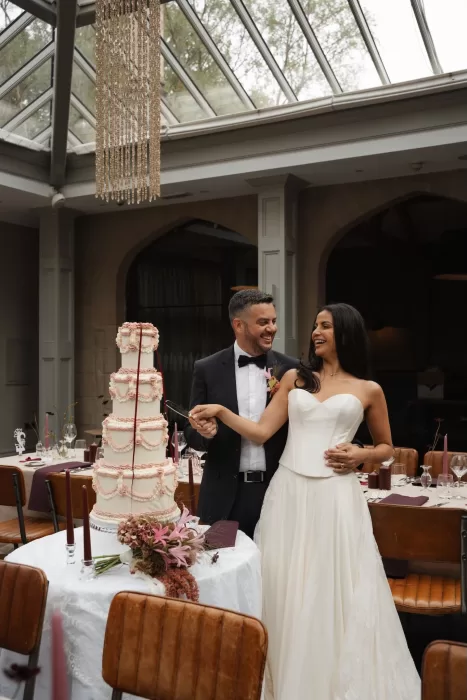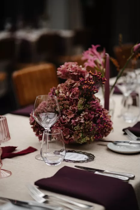 From the bride’s structured gown and floral-edged veil to the statement cake wrapped in burgundy ribbons, each detail blends softness with confidence. The tablescape — with its mauve taper candles, sculptural flowers, and natural linens — embodies quiet luxury, designed for couples who find beauty in tone and texture rather than symmetry.