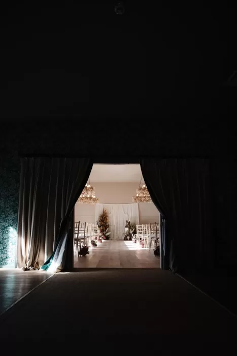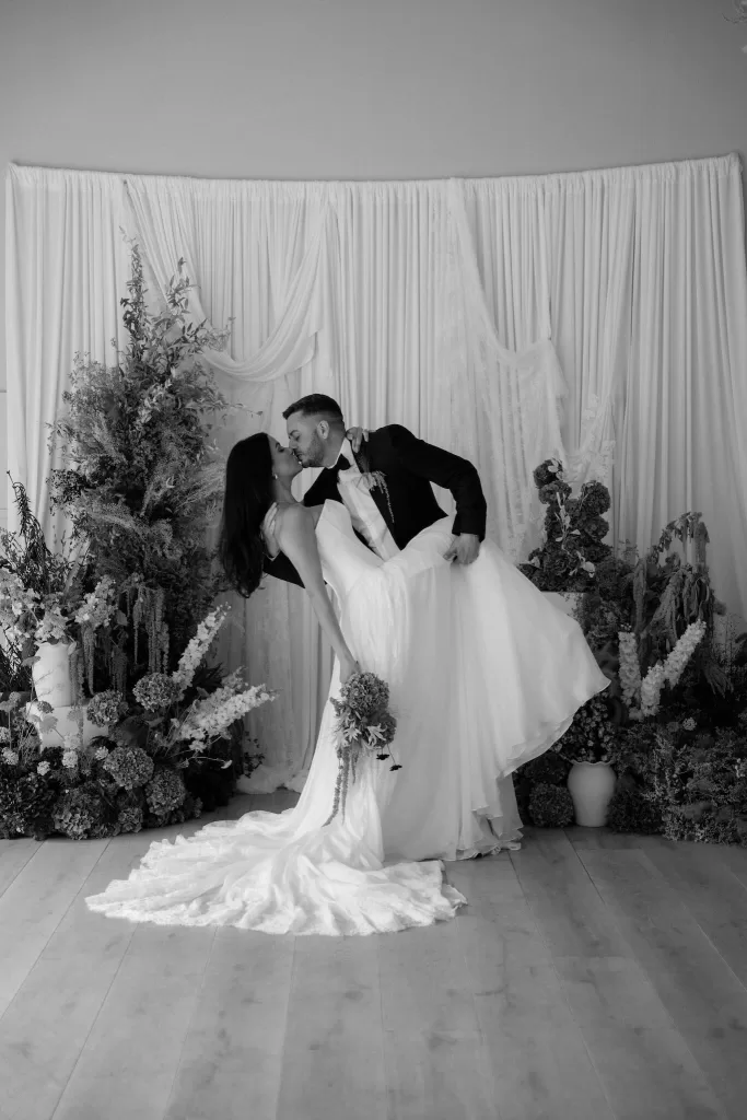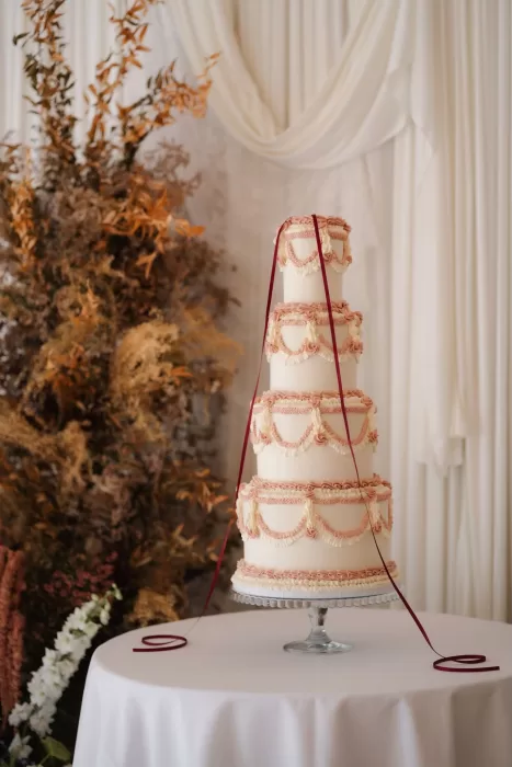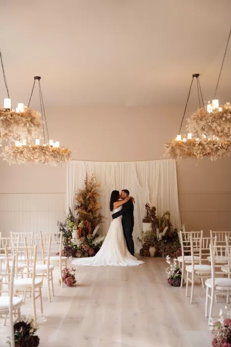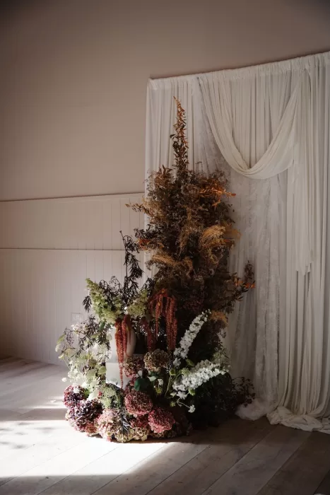 “We also wanted to bring in the autumnal season too – so it wasn’t too Taylor Swift led!” Grace explains. The creative team incorporated colours and florals that reflected the tones outdoors, grounding the modern inspiration in the rich palette of the season. The ceremony space featured gathered ivory drapery and artful floral structures that combined dried foliage with fresh blooms in muted shades of rust, mauve, and ivory.