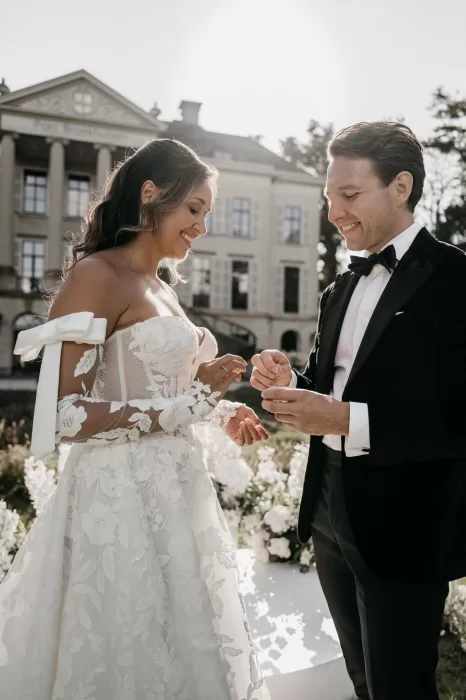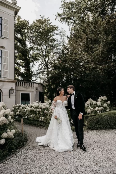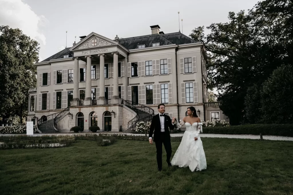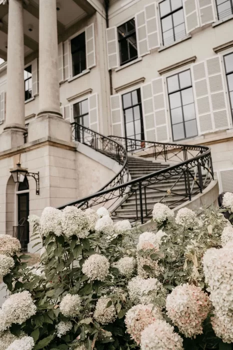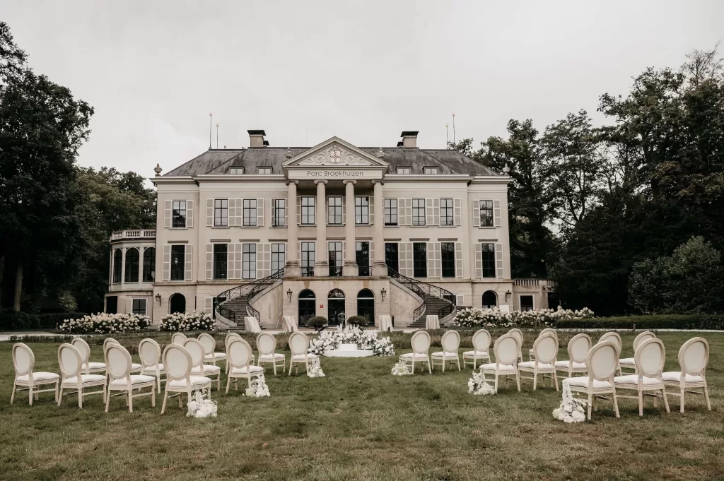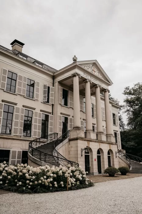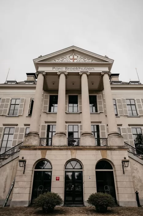 Parc Broekhuizen is one of those rare venues that instantly transports you. With its neoclassical façade, sweeping staircases, and manicured gardens, it feels like a setting designed for modern romance while carrying the weight of history in every detail. For Jade and Marco, it became the canvas of a wedding day filled with refined beauty and timeless atmosphere.
