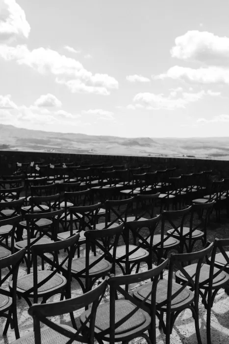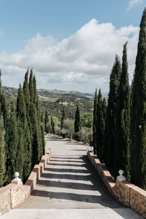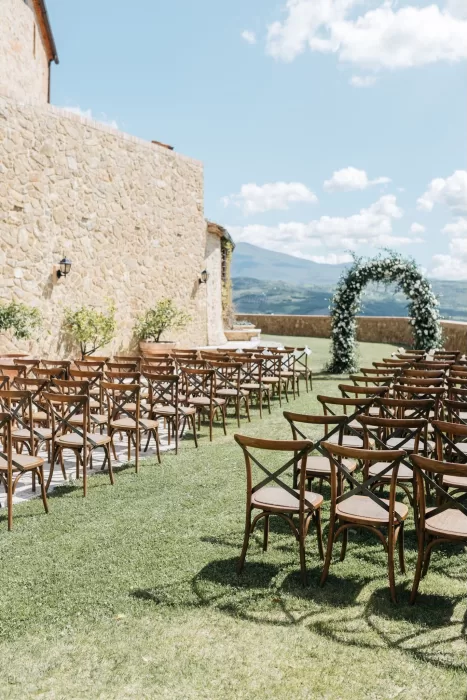 The ceremony unfolded outdoors beneath an arch of fresh greenery and blooms, with the Tuscan hills stretching endlessly beyond. Rows of wooden chairs lined the lawn, creating a natural frame for the exchange of vows. The setting was pared back yet striking, proof that when the landscape is this spectacular, little else is needed. This moment alone shows why Castello di Velona remains one of the most captivating wedding venues in Tuscany.