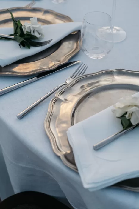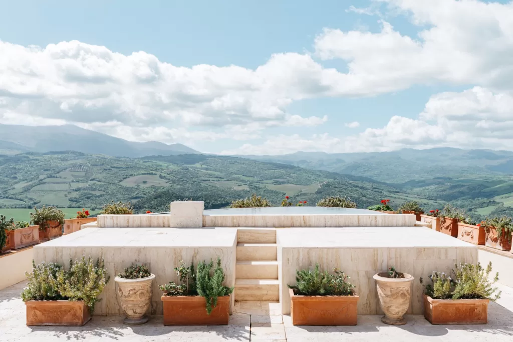 As the sun dipped lower, the celebration moved to the castle’s terrace overlooking an infinity pool that seems to spill into the valley below. Guests dined al fresco under the fading light, with the kind of panoramic views that make this part of Italy a dream for destination weddings. Later, the reception flowed indoors to vaulted spaces dressed in soft candlelight and towering floral arrangements—a seamless balance of grandeur and warmth.