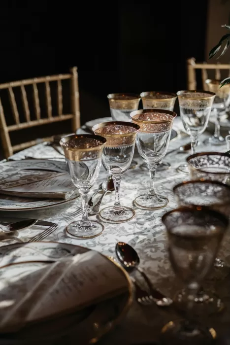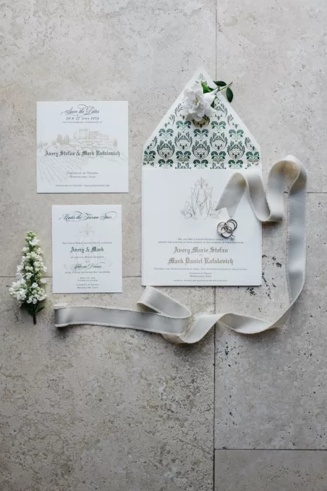 The details carried the couple’s personality in understated ways: an invitation suite with intricate green motifs, crystal glassware edged in gold, and a tiered cake adorned with sculpted blooms. Each touch elevated the atmosphere without overpowering it. It’s a reminder of how thoughtful design can transform a celebration, allowing every guest to feel immersed in the story being told.