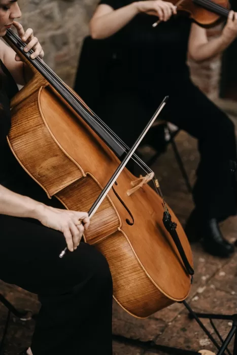 Dinner was held in the villa’s courtyard, with a single long table set under string lights. The tablescape was simple but elevated, with white linen, gold flatware, and low arrangements of cream-toned flowers. A small string ensemble played as guests took their seats.