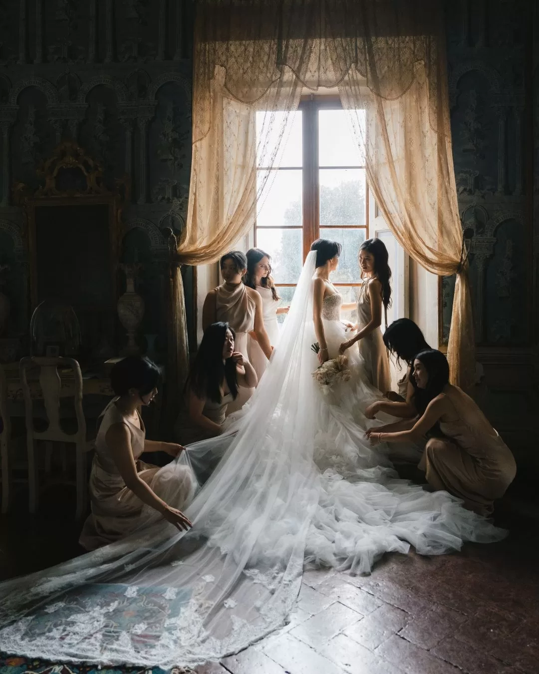 The day opened in a suite layered with antique furnishings and filtered morning light. The bride, dressed in a cloud-like gown of layered tulle, prepared surrounded by her bridesmaids in soft champagne tones. A bouquet of pale blush roses rested on a velvet chair—quietly romantic, just like the setting.