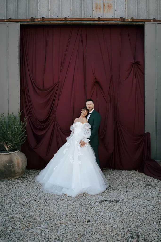 Zaineb’s bridal look brought a fashion-forward presence to the day. Her off-the-shoulder gown featured soft layers of tulle and delicate embroidery, balanced by voluminous sleeves that moved effortlessly with every step. Zlatan complemented the look in a deep green suit, a subtle but confident choice against the rich burgundy backdrop used for portraits and ceremony details. Together, they created a striking visual contrast—soft ivory textures paired with darker tones that echoed throughout the florals and décor.