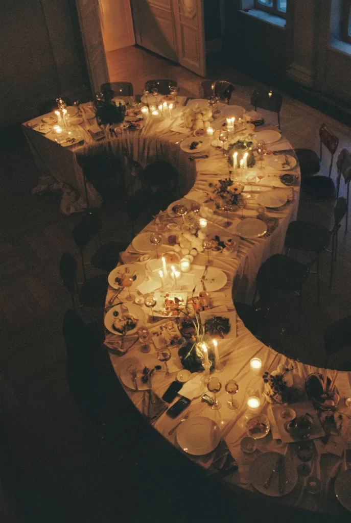 Design plays a central role, particularly through sculptural installations and considered styling choices that feel closer to an art exhibition than a traditional wedding setup. Floral elements are used with intention but never overwhelm; instead, they work in conversation with negative space, architectural lines, and light. Planned by @nesterova.wedding, the overall approach feels curated yet fluid—ideal inspiration for couples who are drawn to weddings with a strong visual point of view.