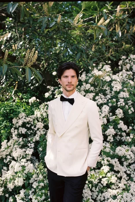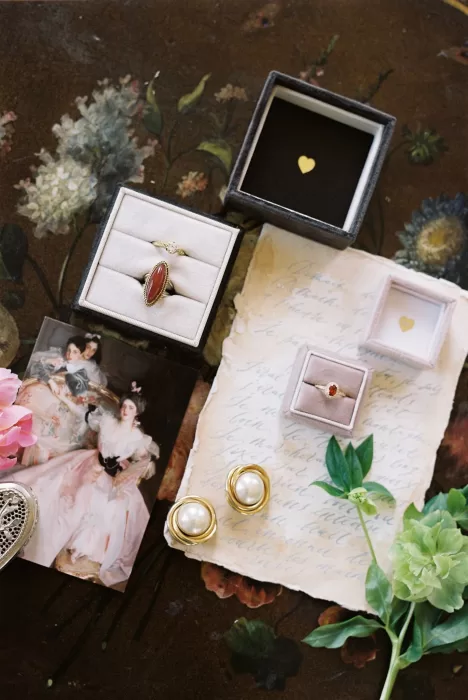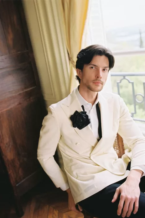 Indoors, the portraits feel even more atmospheric. The groom framed by a window, the couple in a lounge room surrounded by ornate details, the bride captured close-up with a softness usually reserved for editorial shoots — everything about the aesthetic points toward a celebration shaped with restraint rather than excess. The florals, tablescape, and flatlay compositions all speak to a modern approach to château weddings: minimal styling that lets the location breathe.