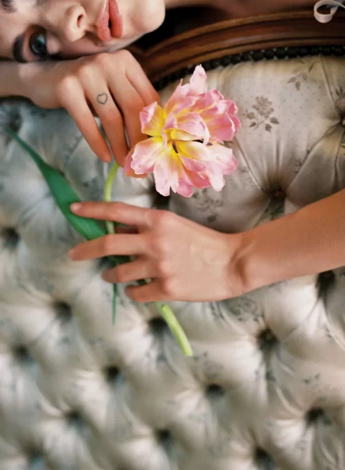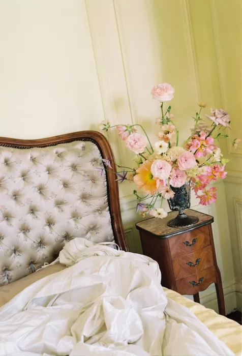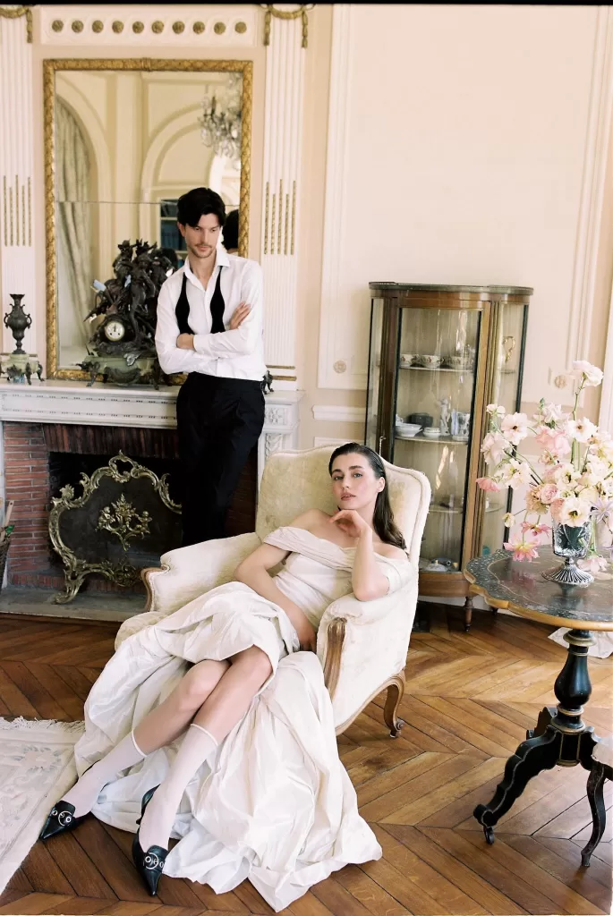 The morning unfolded slowly, captured through still-life details: bridal shoes placed beside antique furniture, florals arranged like a painting, and the bride framed by tall windows that softened the early light. In the bedroom scenes, the photography leans into texture — fabric, stone, and flowers layered together — creating a palette that future couples searching for French wedding venues will immediately recognise as aspirational yet grounded.