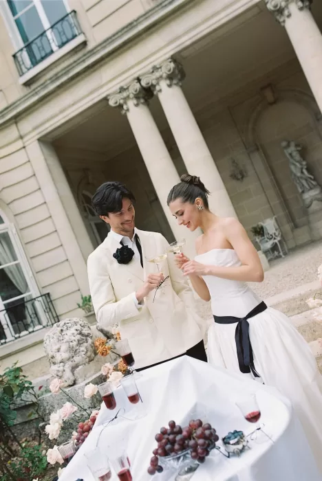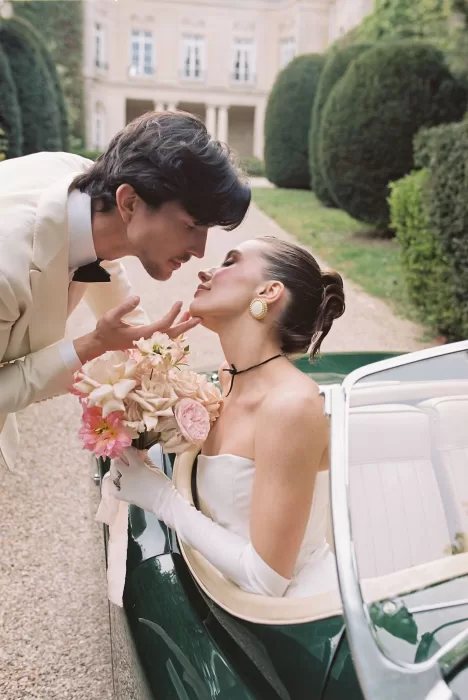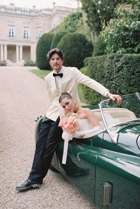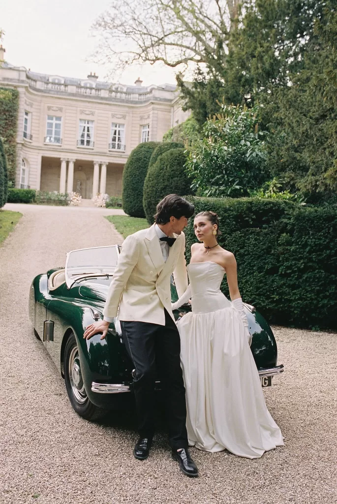A vintage car adds a layer of narrative — a getaway moment, a stolen kiss, a sense of movement against the stillness of the estate. The photographs of the drive down the château’s long approach could easily belong to a classic film reel. Toasting in the courtyard, wrapped in late-afternoon light, the couple look entirely absorbed in the quiet joy of the day. This understated luxury is something couples often search for when browsing French château venues, making it a fitting reference for anyone planning a refined yet intimate celebration.