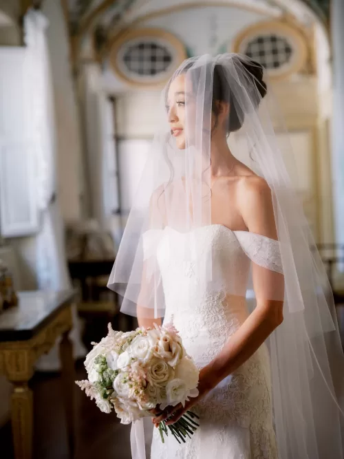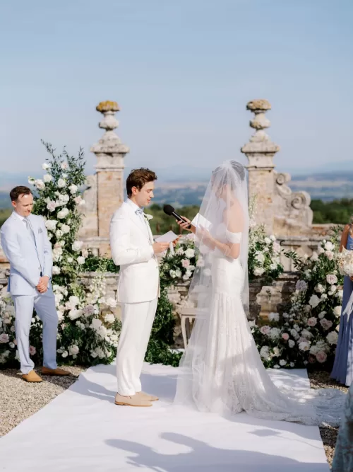 The setting delivered exactly what they had imagined. “Set among the Tuscan landscape, Castello di Celsa offered everything they had imagined: privacy, romance, and the timeless beauty of a fairytale castle.” The ceremony unfolded outdoors beneath open sky, with the castle’s ivy-covered façade and sculpted gardens forming a natural backdrop. Sam wore an off-the-shoulder lace gown with a long, weightless veil, while Peter chose a soft ivory suit with a pale blue bow tie. Close-up photographs capture the ring exchange with quiet focus—her veil catching the light, his hands steady, both smiling with that unmistakable ease first described at the start of their story.