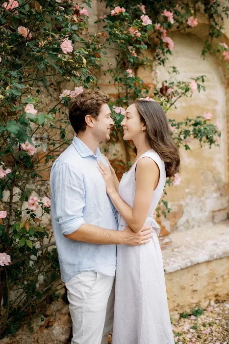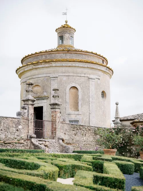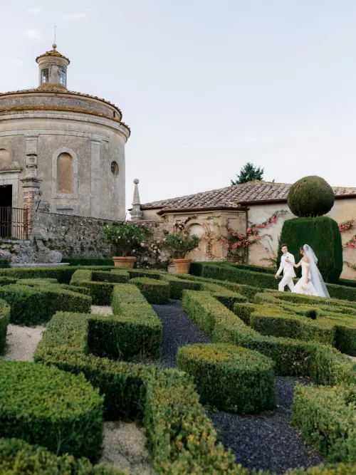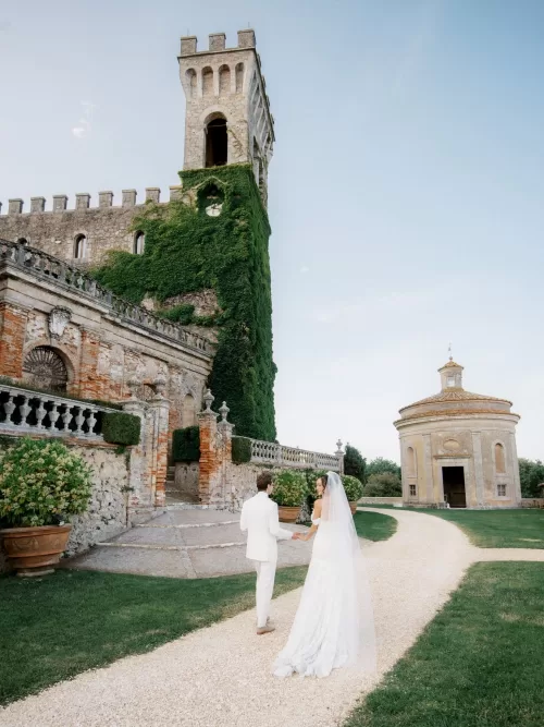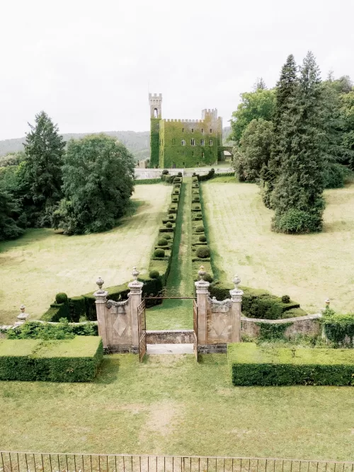 Portraits moved through the castle’s formal Renaissance gardens and along stone walls threaded with pink climbing roses. Aerial views reveal the full composition: turreted towers, parterre gardens, and the surrounding Tuscan countryside stretching beyond the estate walls. For readers browsing venues in Italy or exploring a curated selection of wedding venues in Italy, Castello di Celsa illustrates how historic architecture can feel cinematic without overpowering the celebration itself.