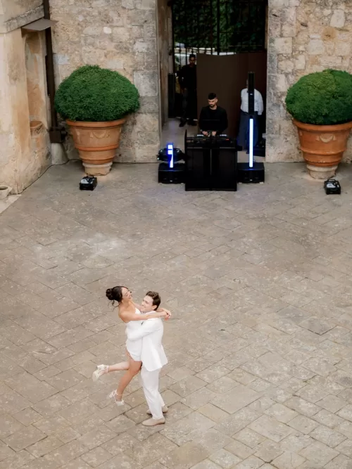 Dinner was set in the courtyard beneath crystal chandeliers suspended against walls wrapped in ivy. Long white tables were dressed with green garlands, pale roses, gold-rimmed glassware and candlelight, while Aperol spritz cocktails added a saturated pop of orange during cocktail hour. As evening settled in, the atmosphere shifted toward music and movement in the stone courtyard, where Sam and Peter spun across the floor for their first dance, framed by the castle entrance and soft lighting. “Surrounded by just 50 of their closest friends and family, Sam and Peter celebrated their love in a place that felt both deeply personal and wonderfully transportive—a wedding rooted not in tradition, but in joy, intuition, and the magic of shared moments.”