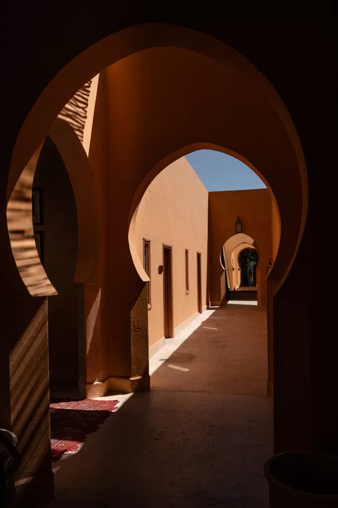 The architectural language of Jnane Tamsna set the tone from the start. Warm corridors curved toward hidden courtyards, creating cinematic pockets of light where portraits felt both modern and rooted in the place. The bride’s portraits—whether standing beneath an arch or walking through the terracotta stairways—balance softness with sharp, graphic lines. It’s no surprise the photographers shared, “The atmosphere in Morocco is something truly special,” reflecting how the location shaped not just the backdrop, but the mood of the day itself.