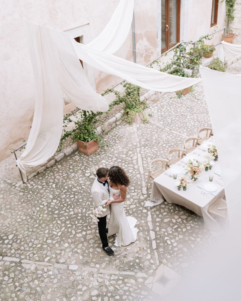 Soft light, honeyed stone, and a courtyard strung with ivory drapes — this wedding at Finca Morneta in Mallorca is a study in laid-back elegance with a fashion-forward twist.