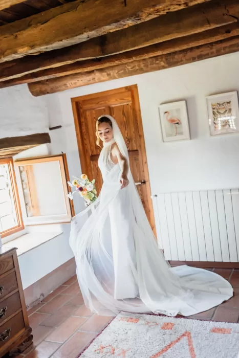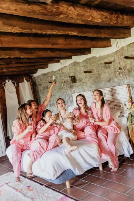 The morning began with joy and anticipation as the bridal party gathered in matching gingham pyjamas, glasses of fizz in hand, beneath rustic beams and soft Mediterranean light. The relaxed energy set the tone for what would be an effortlessly flowing day — a celebration that felt natural and unhurried, shaped by connection rather than convention.