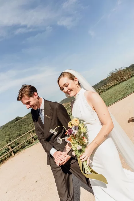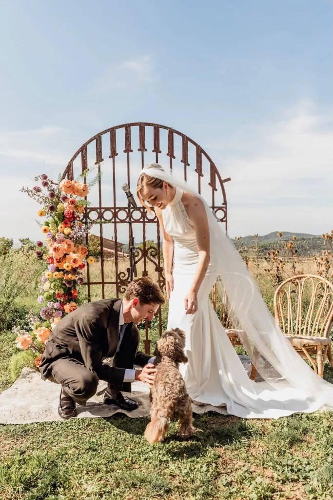 Under the Catalonian sun, guests arrived at the ceremony — a romantic open-air setting framed by wild fields and a floral installation in warm summer tones. Anna recalls, “It felt like stepping into a timeless summer film — full of colour, laughter, and genuine connection.”