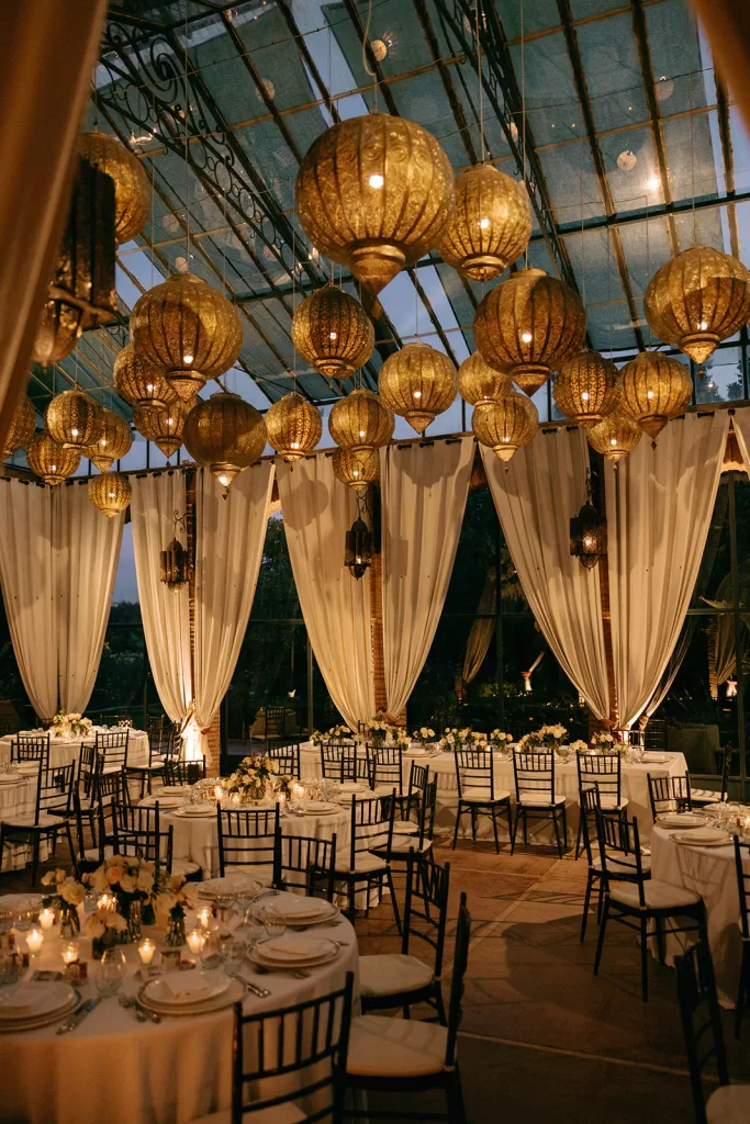 Picture cocktails and canapés in a flower-filled courtyard at sunset, followed by a seated dinner in the Orangeraie ballroom under soaring glass ceilings or in the romantic greenhouse surrounded by candlelight.