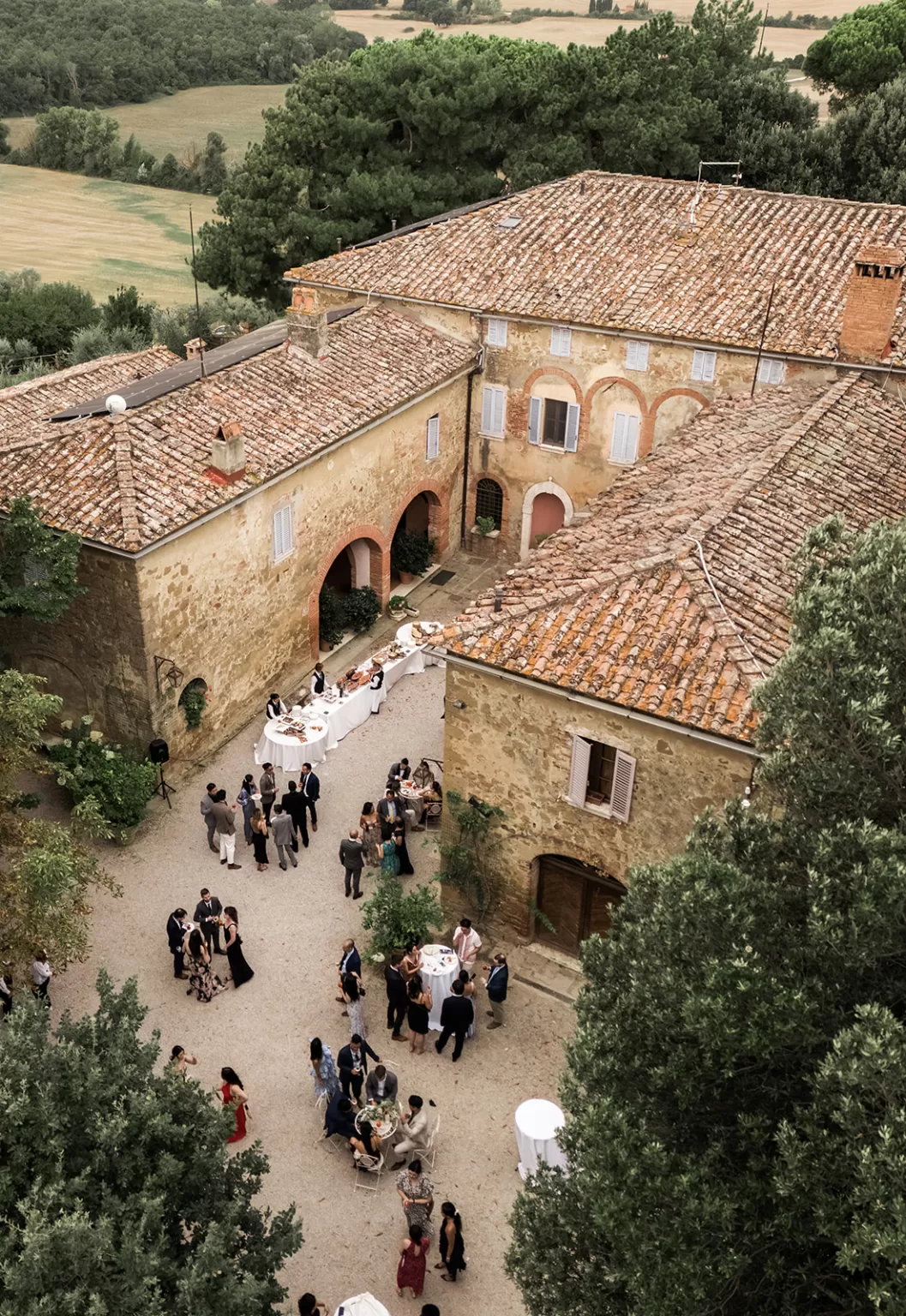 Each space across the hamlet, from its sun trapping courtyards to the chapel and tree-lined lawns, is filled with atmosphere, ready to shape the flow of a celebration that lasts all weekend. The estate is a natural fit for couples looking to balance elegance and with that Tuscan authenticity many dream of on their big day.