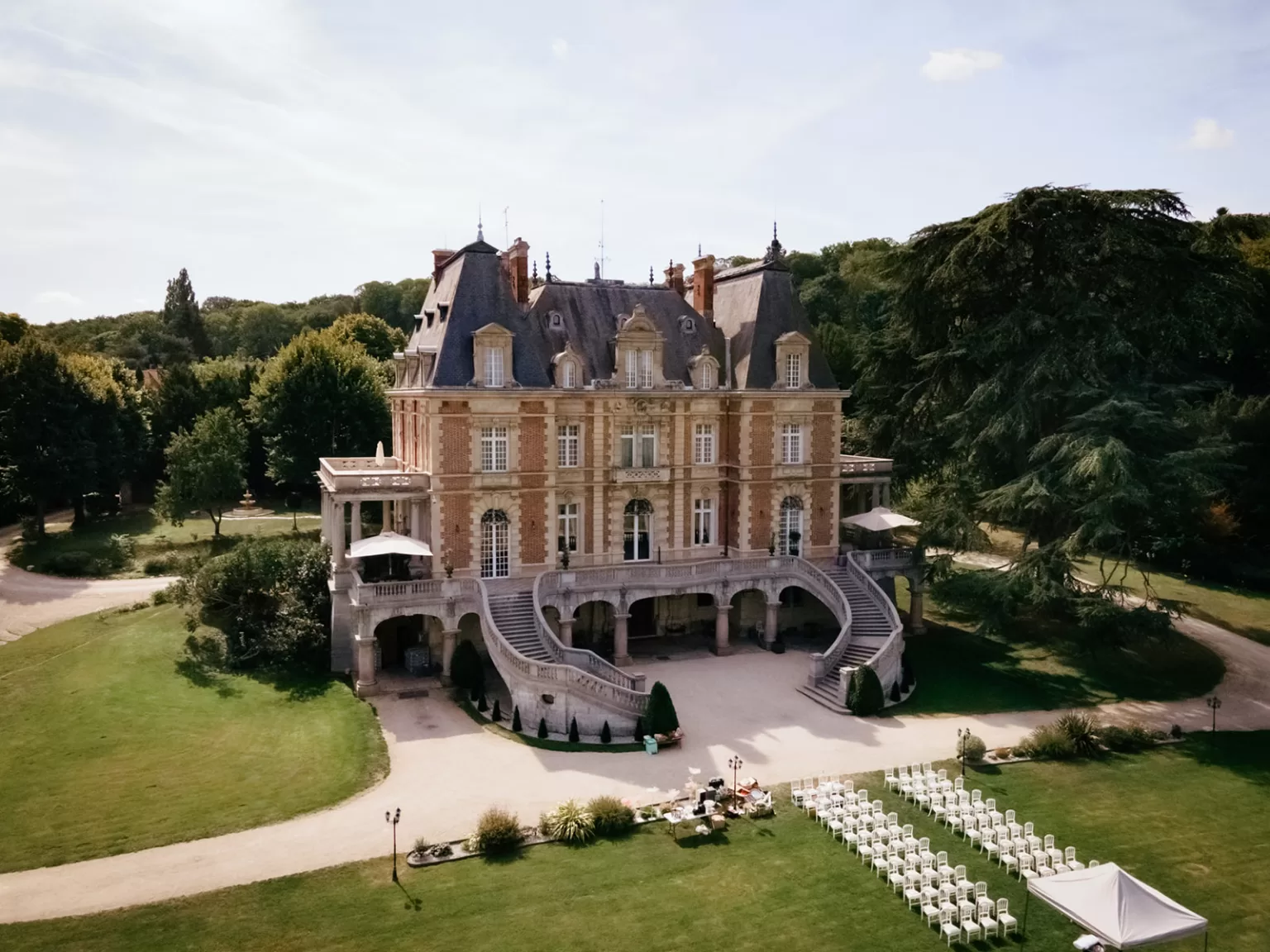 The estate spans three hectares of manicured French gardens, multi‑level terraces, and expansive lawns that can be transformed for ceremonies, cocktails, outdoor dining, and photography. These beautifully orchestrated outdoor spaces pair seamlessly with the château’s five reception salons, each equipped with modern event‑ready amenities such as sound systems, lighting options, and adaptable layouts for seated dinners, cocktails, or late‑night dancing.