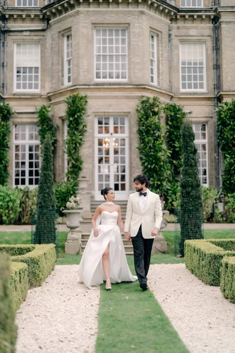 What makes Hedsor House distinct is that sense of symmetry softened by landscape. The façade is formal, almost severe at first glance, yet the gardens, stone steps, and greenery take the edge off, giving it a more relaxed rhythm. It feels polished without becoming ornamental — a country house wedding venue near London with a visual language that is structured, refined, and unmistakably British.