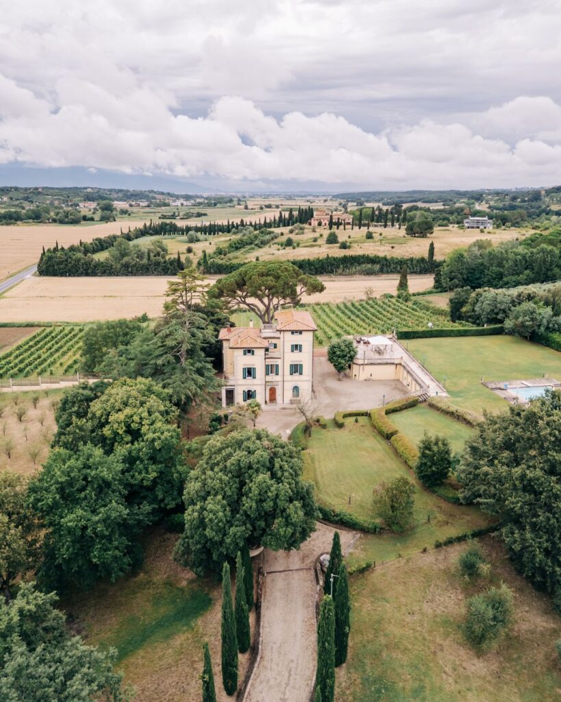Villa Donna Camilla offers several stunning ceremony spots, each with its own character and appeal. Couples can exchange vows under the shade of ancient olive trees, surrounded by the peaceful Tuscan landscape. Alternatively, the villa’s formal Italian gardens create an elegant setting with colorful flowers and stately cypress trees. For those who prefer a vineyard backdrop, the estate’s perfectly aligned grapevines offer a romantic and classic option.